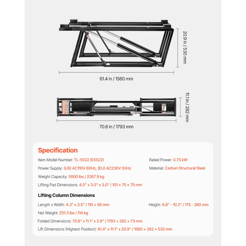 Whether you’re performing oil changes, brake jobs, tire rotations, or general vehicle maintenance, this easy-to-use, space-saving car lift allows you to elevate your vehicle effortlessly with the push of a button.