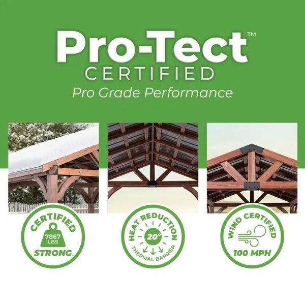Transform your ordinary outdoor living space with Backyard Discovery’s grand Arlington Gazebo. Made from 100% Cedar wood, the Arlington is naturally resistant to rot and decay while also being a Pro-Tect-certified performance structure. Pro-Tect testing certifies the Arlington to withstand up to 7,886 pounds of weight along with a wind certification of up to 100 mph.