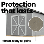 - Made with engineered wood siding, pre-primed and treated for decay and insect resistance.