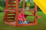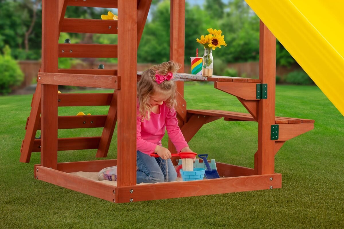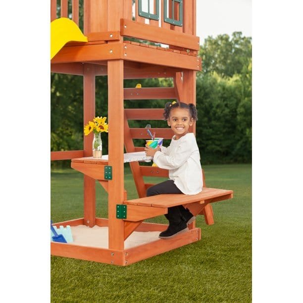 - Built-in picnic table and sand play area beneath the tower