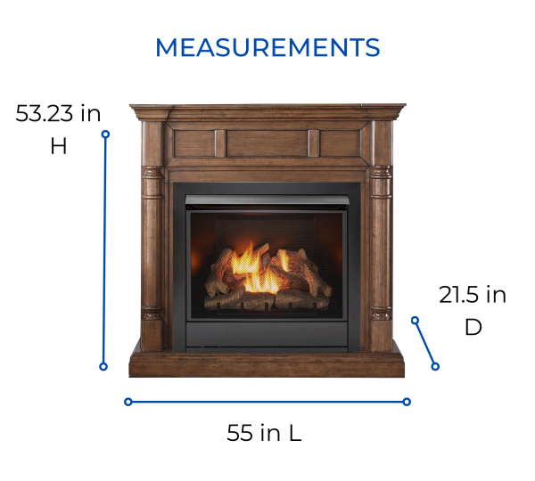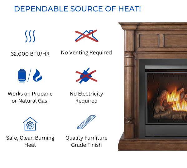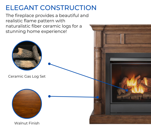 The Duluth Forge Ventless Fireplace (FDI32R-M-WN) features realistic fiber ceramic logs for a stunning experience. Make your house feel like home with our Furniture Grade Quality Mantel and Full-Size Duluth Forge Dual Fuel Ventless Gas Fireplace Insert. The product is made to produce up to 32,000 BTU of heat, enough to heat 1,500 square feet of living space. The rich walnut fireplace mantel finish is a great compliment to any home décor.