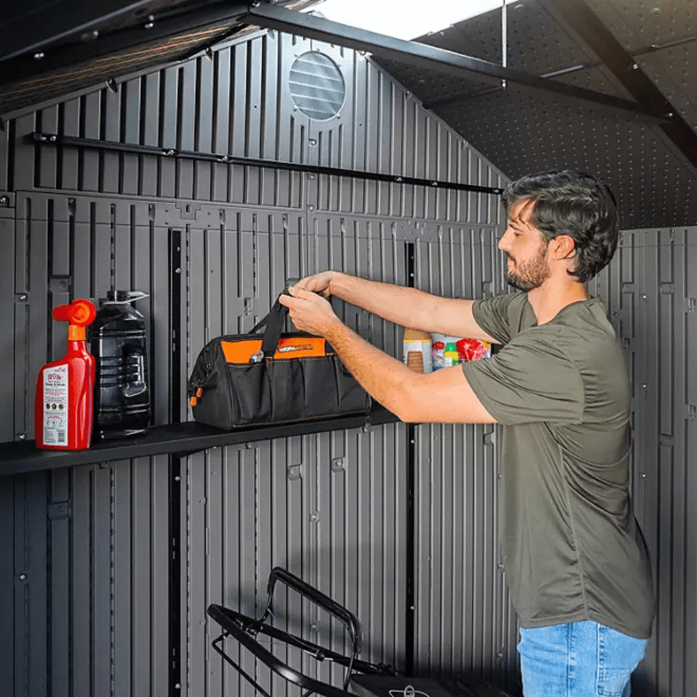Lifetime 10 ft. x 8 ft. Outdoor Storage Shed is the perfect solution for expanding storage space while enhancing the aesthetic appeal of your backyard. Designed for convenience and functionality, this shed features centrally located double doors, providing easy access to stored items. With an adjustable shelving system, you can customize the interior layout to suit your storage needs.