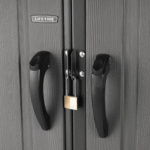 Its UV-protected, weather-resistant construction and high-pitched roof for efficient water drainage make it an ideal year-round storage solution. With built-in shelving, skylights, and steel-reinforced, lockable double doors, this shed provides security, functionality, and convenience—all in one.
