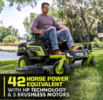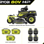 Introducing RYOBI’s first lithium-ion battery powered zero turn riding mower, the RYOBI 80V HP 54″ Lithium Electric ZTR*. HP Technology and 80V batteries combine to deliver the power equivalent of a 42 horsepower gas engine*, while eliminating the hassle and maintenance of a gas mower. This rider cuts up to 4 acres per charge with the help of 5 brushless motors, (3) 80V 10Ah batteries, and (4) 40V 12Ah batteries, with a Hyper Charger that fully recharges in 5 hours so you’re ready for your next job. The revolutionary iDrive system uses an intuitive one-handed joystick steering to maneuver around objects more easily than a traditional ZTR. The innovative LCD screen displays runtime, battery life, and cut/drive speed while in use, while the Riding Mower app allows you to monitor charge time and battery life remotely. This riding mower features the CROSS CUT multi blade system, providing superior cutting & mulching performance, while the 12-point height adjustment allows you to select the perfect cutting height between 1.5″ and 4.5″. The rubber side discharge chute makes it easy to maneuver around landscaping so users are not restricted by where they can cut. Designed with comfort and convenience in mind, this mower features premium seat suspension, 2 USB ports to charge phones, a storage compartment, and LED headlights. Mobile Service available in select regions. If your riding mower requires attention, a certified RYOBI support technician can diagnose & service right from your home. Some services may require you to bring your mower to one of the 300+ service centers nationwide. Lawn maintenance will never be the same thanks to the RYOBI 80V HP Brushless 54″ Lithium Electric Zero Turn Riding Mower.