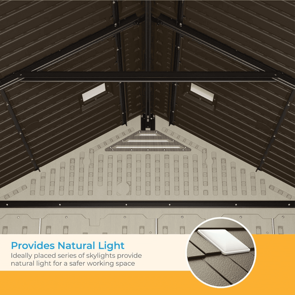 Keep your outdoor space organized and clutter-free with the Suncast Vanilla Resin Storage Shed. Designed for strength, durability, and convenience, this spacious multi-wall resin shed offers ample storage space for power equipment, tools, bicycles, ladders, and other outdoor essentials. Built with weather-resistant polypropylene resin panels and a reinforced heavy-duty floor, this shed provides long-lasting protection against the elements while supporting heavy-duty storage needs.