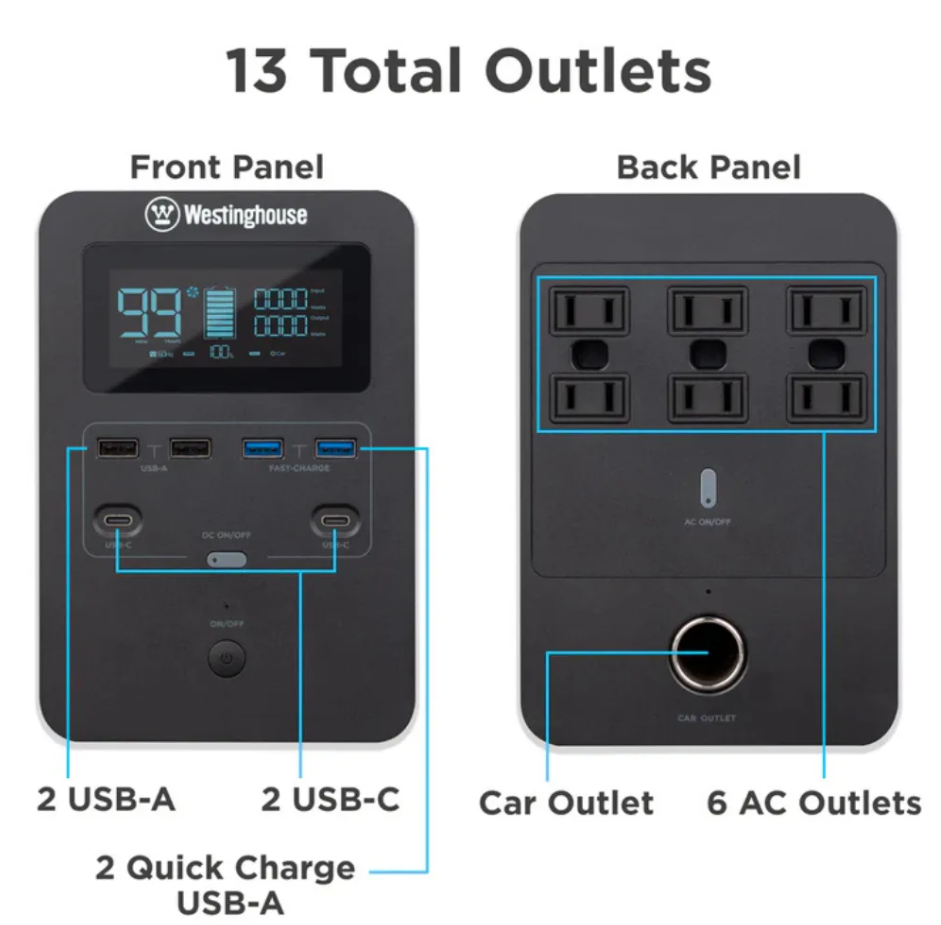 Features a variety of output ports including standard AC outlets, USB ports, and a DC port. This versatility allows you to power or charge laptops, smartphones, lights, and more—all from one unit.